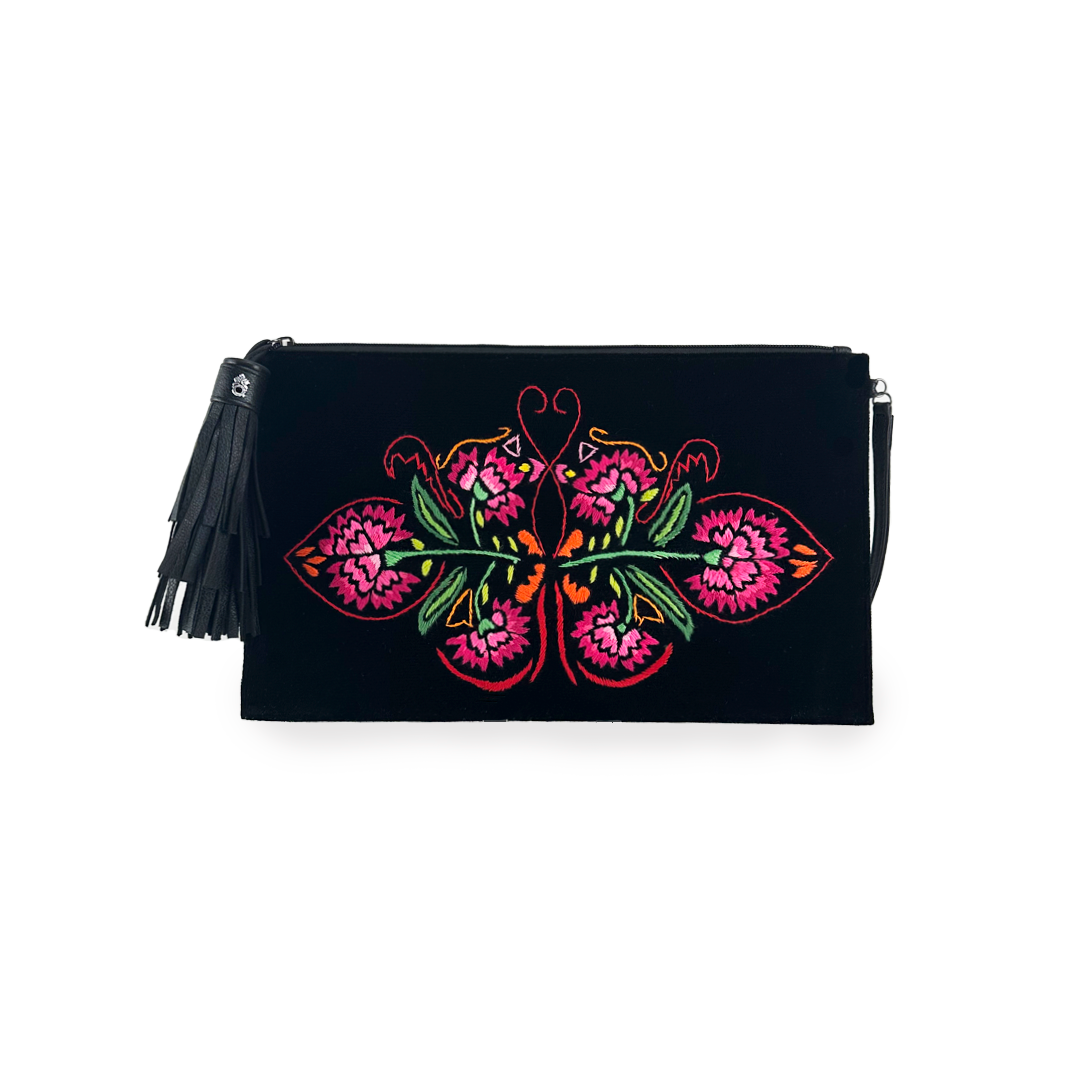 Inspired by the thin paper flags that decorate traditional Oaxacan jícaras, it is extremely elegant due to its rectangular and flat shape, which allows you to neatly store makeup, mobile phone, wallet, and keys.