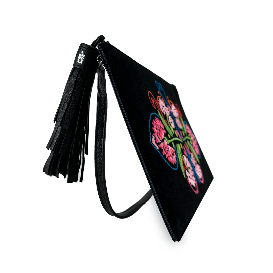 Inspired by the thin paper flags that decorate traditional Oaxacan jícaras, it is extremely elegant due to its rectangular and flat shape, which allows you to neatly store makeup, mobile phone, wallet, and keys.
