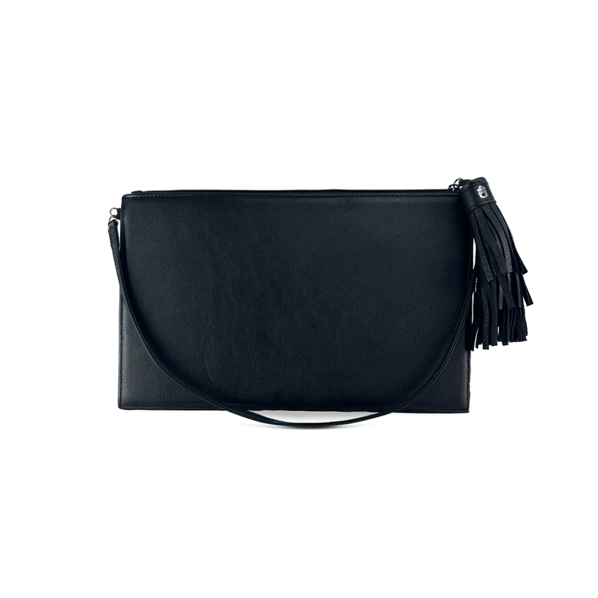 Although fairly large, it can even fit an 11” iPad Pro! This unique evening bag features an ultra-thin leather strap for easy carrying on the shoulder if preferred. However, the beautiful leather tassel with the zip is undoubtedly the perfect surprise detail.