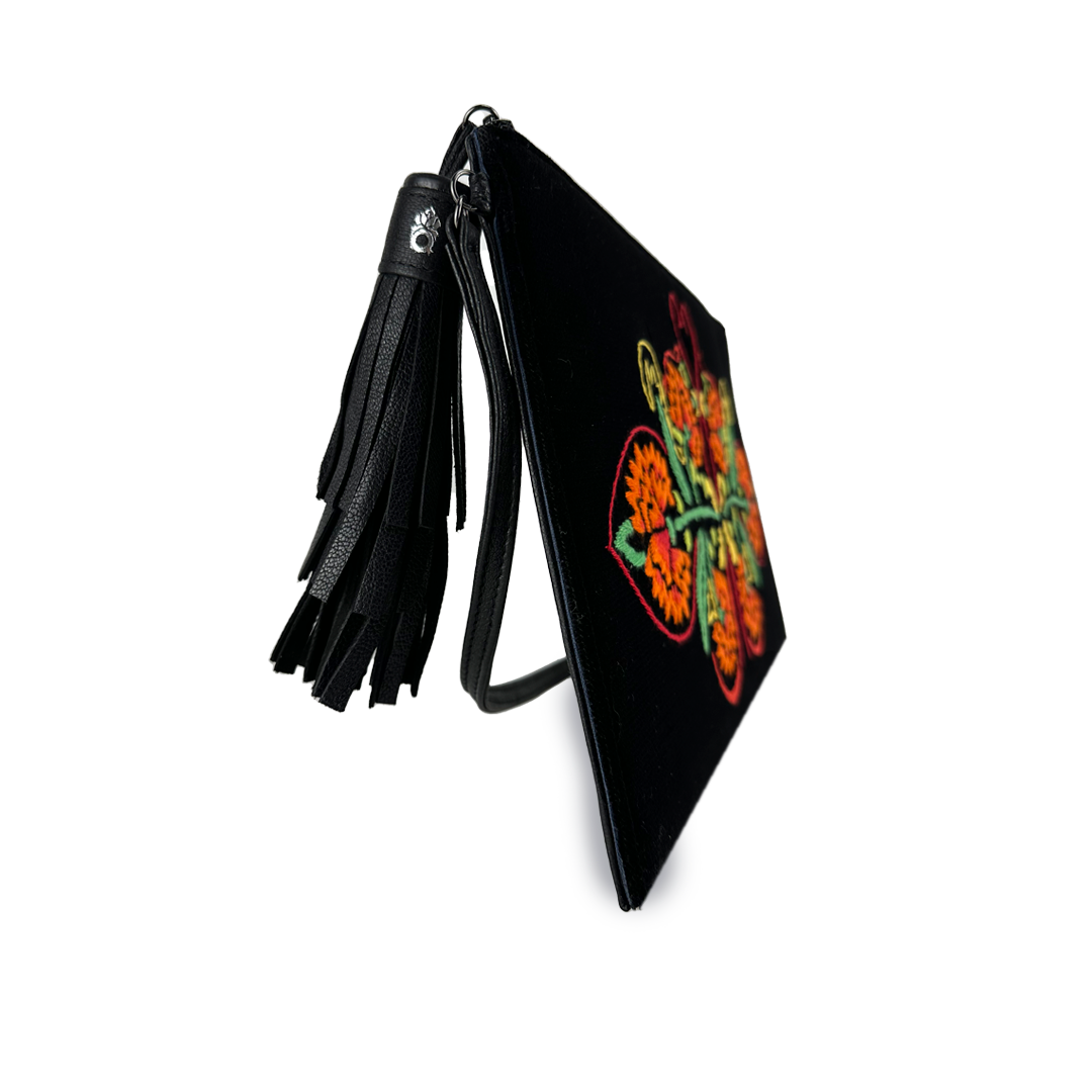 Inspired by the thin paper flags that decorate traditional Oaxacan jícaras, it is extremely elegant due to its rectangular and flat shape, which allows you to neatly store makeup, mobile phone, wallet, and keys.