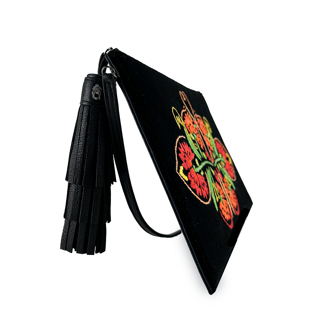 Inspired by the thin paper flags that decorate traditional Oaxacan jícaras, it is extremely elegant due to its rectangular and flat shape, which allows you to neatly store makeup, mobile phone, wallet, and keys.